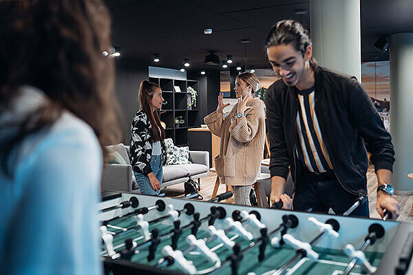 Im Gemeinschaftsraum könnt ihr gemeinsam kochen, Filmabende veranstalten oder wer es gern sportlicher mag, sich auch mal am Tischkicker mit anderen messen.